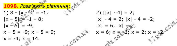 Розв’яжіть рівняння: 1) 8 - |х - 5| = -1; |x – 5| = -1 – 8; |x – 5| = -9; x – 5 = -9; x – 5 = 9; x = -4; x = 14. 2) ||х| - 4| = 2; |x| - 4 = 2; |x| - 4 = -2; |x| = 6; |x| = 2; x = 6; x = -6; x = 2; x = -2.