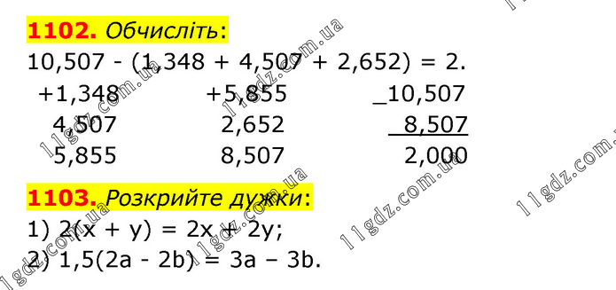 1102. Обчисліть: 10,507 - (1,348 + 4,507 + 2,652) = 2. 1103. Розкрийте дужки: 1) 2(х + у) = 2х + 2у; 2) 1,5(2а - 2b) = 3а – 3b.
