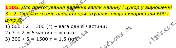 Для приготування варення взяли малину і цукор у відношенні 3 : 2. Скільки грамів варення приготували, якщо використали 600 г цукру? 1) 600 : 2 = 300 (г) – вага однієї частини; 2) 3 + 2 = 5 частин – всього; 3) 300 • 5 = 1500 г = 1,5 (кг).