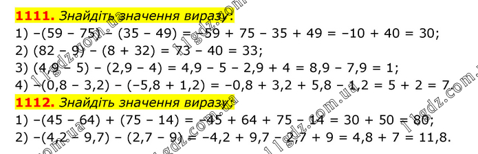 1111. Знайдіть значення виразу: 1) –(59 – 75) – (35 – 49) = –59 + 75 – 35 + 49 = –10 + 40 = 30; 2) (82 – 9) – (8 + 32) = 73 – 40 = 33; 3) (4,9 – 5) – (2,9 – 4) = 4,9 – 5 – 2,9 + 4 = 8,9 – 7,9 = 1; 4) –(0,8 – 3,2) – (–5,8 + 1,2) = –0,8 + 3,2 + 5,8 – 1,2 = 5 + 2 = 7. 1112. Знайдіть значення виразу: 1) –(45 – 64) + (75 – 14) = –45 + 64 + 75 – 14 = 30 + 50 = 80; 2) –(4,2 – 9,7) – (2,7 – 9) = –4,2 + 9,7 – 2,7 + 9 = 4,8 + 7 = 11,8.