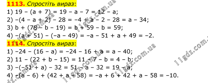 1113. Спростіть вираз: 1) 19 – (а + 7) = 19 – a – 7 = 12 – a; 2) –(4 – а + 2) – 28 = –4 + a – 2 – 28 = a – 34; 3) b + (78 – b – 19) = b + 59 – b = 59; 4) –(а + 51) – (–а – 49) = –a – 51 + a + 49 = –2. 1114. Спростіть вираз: 1) –24 – (16 – а) = –24 – 16 + a = a – 40; 2) 11 – (22 + b – 15) = 11 – 7 – b = 4 – b; 3) –(–51 + а) – 32 = 51 – a – 32 = 19 – a; 4) –(а – 6) + (42 + а – 58) = –a + 6 + 42 + a – 58 = –10.