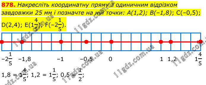 Накресліть координатну пряму з одиничним відрізком завдовжки 25 мм і позначте на ній точки: А(1,2); В(–1,8); С(–0,5); D(2,4); E(14/5); F(–21/5). 1,8 = 14/5; 1,2 = 11/5; 0,5 = 1/2;