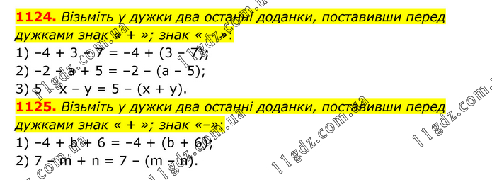 1124. Візьміть у дужки два останні доданки, поставивши перед дужками знак « + »; знак « – »: 1) –4 + 3 – 7 = –4 + (3 – 7); 2) –2 – а + 5 = –2 – (а – 5); 3) 5 – х – у = 5 – (х + у). 1125. Візьміть у дужки два останні доданки, поставивши перед дужками знак « + »; знак «–»: 1) –4 + b + 6 = –4 + (b + 6); 2) 7 – m + n = 7 – (m – n).