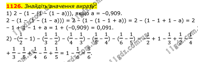 Знайдіть значення виразу: 1) 2 – (1 – (1 – (1 – а))), якщо а = –0,909. 2 – (1 – (1 – (1 – а))) = 2 – (1 – (1 – 1 + а)) = 2 – (1 – 1 + 1 – а) = 2 – 1 + 1 – 1 + а = 1 + (–0,909) = 0,091. 2) –(1/2 – 1) – (1/3 – 1/2) – (1/4 – 1/3) – (1/5 – 1/4) – (1/6 – 1/5) = –1/2 + 1 – 1/3 + 1/2 – 1/4 + 1/3 – 1/5 + 1/4 – 1/6 + 1/5 = 1 – 1/6 = 5/6.