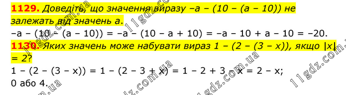 1129. Доведіть, що значення виразу –а – (10 – (а – 10)) не залежать від значень а. –а – (10 – (а – 10)) = –а – (10 – а + 10) = –а – 10 + а – 10 = –20. 1130. Яких значень може набувати вираз 1 – (2 – (3 – х)), якщо |х| = 2? 1 – (2 – (3 – х)) = 1 – (2 – 3 + х) = 1 – 2 + 3 – х = 2 – х; 0 або 4.