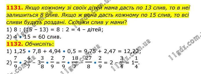 1131. Якщо кожному зі своїх дітей мама дасть по 13 слив, то в неї залишиться 8 слив. Якщо ж вона дасть кожному по 15 слив, то всі сливи будуть роздані. Скільки слив у мами? 1) 8 : (15 – 13) = 8 : 2 = 4 – дітей; 2) 4 • 15 = 60 слив. 1132. Обчисліть: 1) 1,25 • 7,8 + 4,94 • 0,5 = 9,75 + 2,47 = 12,22; 2) 7/9 • 24/7 – 33/8 • 2/9 = 7/9 • 18/7 – 27/8 • 2/9 = 2 – 3/4 = 11/4.