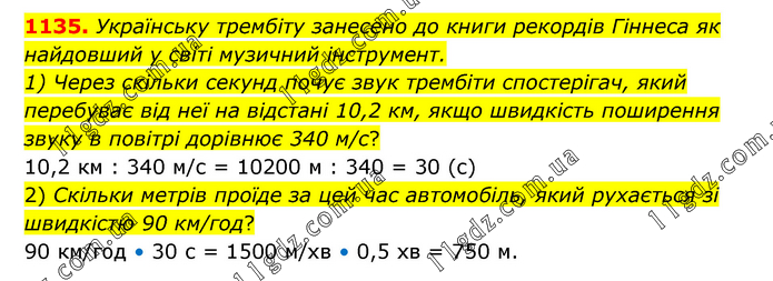 1135. Українську трембіту занесено до книги рекордів Гіннеса як найдовший у світі музичний інструмент. 1) Через скільки секунд почує звук трембіти спостерігач, який перебуває від неї на відстані 10,2 км, якщо швидкість поширення звуку в повітрі дорівнює 340 м/с? 10,2 км : 340 м/с = 10200 м : 340 = 30 (с) 2) Скільки метрів проїде за цей час автомобіль, який рухається зі швидкістю 90 км/год? 90 км/год • 30 с = 1500 м/хв • 0,5 хв = 750 м.