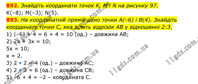 892. Знайдіть координати точок К, M і N на рисунку 97. К(–8); M(–3); N(5). 893. На координатній прямій дано точки А(–6) і В(4). Знайдіть координату точки С, яка ділить відрізок AB у відношенні 2:3. 1) |–6| + 4 = 6 + 4 = 10 (од.) – довжина АВ; 2) 2х + 3х = 10; 5х = 10; х = 2. 3) 2 • 2 = 4 (од.) – довжина АС; 4) 2 • 3 = 6 (од.) – довжина СВ; 5) –6 + 4 = –2 – координата С.