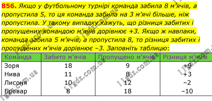 Якщо у футбольному турнірі команда забила 8 м’ячів, а пропустила 5, то ця команда забила на 3 м’ячі більше, ніж пропустила. У такому випадку кажуть, що різниця забитих і пропущених командою м’ячів дорівнює +3. Якщо ж навпаки, команда забила 5 м’ячів, а пропустила 8, то різниця забитих і пропущених м’ячів дорівнює –3. Заповніть таблицю:
