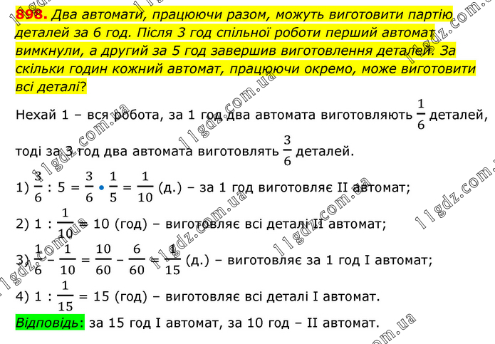 Два автомати, працюючи разом, можуть виготовити партію деталей за 6 год. Після 3 год спільної роботи перший автомат вимкнули, а другий за 5 год завершив виготовлення деталей. За скільки годин кожний автомат, працюючи окремо, може виготовити всі деталі? Нехай 1 – вся робота, за 1 год два автомата виготовляють 1/6 деталей, тоді за 3 год два автомата виготовлять 3/6 деталей. 1) 3/6 : 5 = 3/6 • 1/5 = 1/10 (д.) – за 1 год виготовляє ІІ автомат; 2) 1 : 1/10 = 10 (год) – виготовляє всі деталі ІІ автомат; 3) 1/6 – 1/10 = 10/60 – 6/60 = 1/15 (д.) – виготовляє за 1 год І автомат; 4) 1 : 1/15 = 15 (год) – виготовляє всі деталі І автомат. Відповідь: за 15 год І автомат, за 10 год – ІІ автомат.