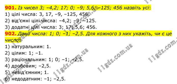 901. Із чисел 3; –4,2; 17; 0; –9; 5,6; –125; 456 назвіть усі: 1) цілі числа: 3, 17, –9, –125, 456. 2) від’ємні цілі числа: –4,2; –9; –125. 3) додатні цілі числа: 3; 17; 5,6; 456. 902. Дано числа: 1; 0; –1; –2,5. Для кожного з них укажіть, чи є це число: 1) натуральним: 1. 2) цілим: 1; –1. 3) раціональним: 1; 0; –1; –2,5. 4) дробовим; –2,5. 5) невід’ємним; 1. 6) недодатним: –1; –2,5.