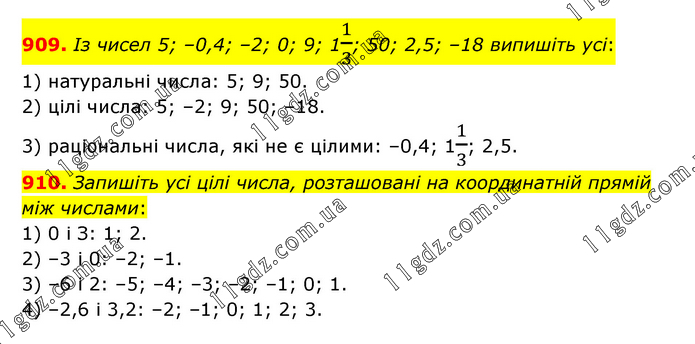 909. Із чисел 5; –0,4; –2; 0; 9; 11/3; 50; 2,5; –18 випишіть усі: 1) натуральні числа: 5; 9; 50. 2) цілі числа: 5; –2; 9; 50; –18. 3) раціональні числа, які не є цілими: –0,4; 11/3; 2,5. 910. Запишіть усі цілі числа, розташовані на координатній прямій між числами: 1) 0 і З: 1; 2. 2) –3 і 0: –2; –1. 3) –6 і 2: –5; –4; –3; –2; –1; 0; 1. 4) –2,6 і 3,2: –2; –1; 0; 1; 2; 3.