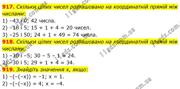 917. Скільки цілих чисел розташовано на координатній прямій між числами: 1) –43 і 0; 42 числа. 2) –16 і 5; 15 + 1 + 4 = 20 чисел. 3) –25 і 50; 24 + 1 + 49 = 74 числа. 918. Скільки цілих чисел розташовано на координатній прямій між числами: 1) –30 і –5; 30 – 5 – 1 = 24. 2) –30 і 5; 29 + 1 + 4 = 34. 919. Знайдіть значення х, якщо: 1) –(–(–х)) = –1; х = 1. 2) –(–(–х)) = 4; х = –4.
