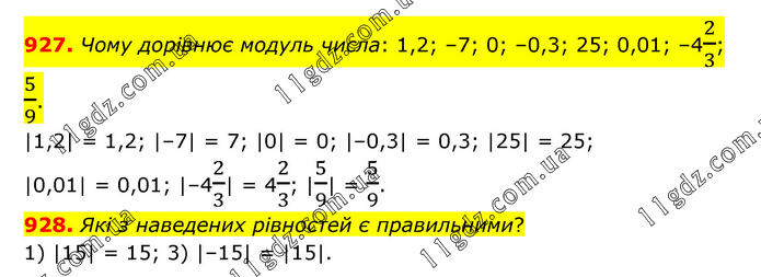 927. Чому дорівнює модуль числа: 1,2; –7; 0; –0,3; 25; 0,01; –42/3; 5/9. |1,2| = 1,2; |–7| = 7; |0| = 0; |–0,3| = 0,3; |25| = 25; |0,01| = 0,01; |–42/3| = 42/3; |5/9| = 5/9. 928. Які з наведених рівностей є правильними? 1) |15| = 15; 3) |–15| = |15|.