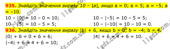 935. Знайдіть значення виразу 10 – |а|, якщо а = 0; а = 5; а = –5; а = –10. 10 – |0| = 10 – 0 = 10; 10 – |5| = 10 – 5 = 5; 10 – |–5| = 10 – 5 = 5; 10 – |–10| = 10 – 10 = 0. 936. Знайдіть значення виразу |b| + 6, якщо b = 0; b = –4; b = 4. |0| + 6 = 0 + 6 = 6; |–4| + 6 = 4 + 6 = 10; |4| + 6 = 4 + 6 = 10.