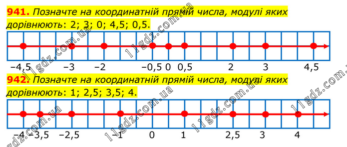 941. Позначте на координатній прямій числа, модулі яких дорівнюють: 2; 3; 0; 4,5; 0,5. 942. Позначте на координатній прямій числа, модулі яких дорівнюють: 1; 2,5; 3,5; 4.