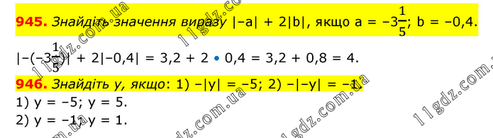 945. Знайдіть значення виразу |–а| + 2|b|, якщо а = –31/5; b = –0,4. |–(–31/5)| + 2|–0,4| = 3,2 + 2 • 0,4 = 3,2 + 0,8 = 4. 946. Знайдіть у, якщо: 1) –|у| = –5; 2) –|–у| = –1. 1) y = –5; y = 5. 2) y = –1; y = 1.