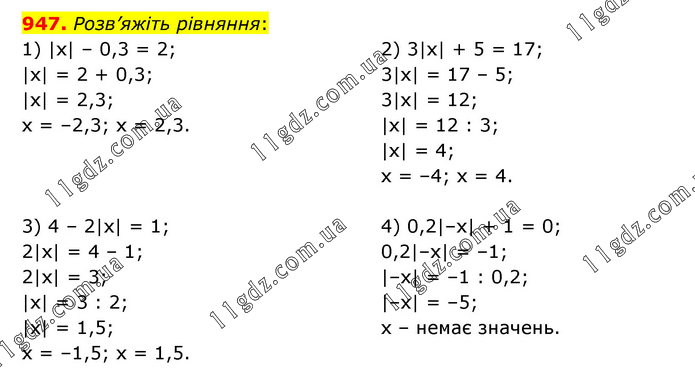 947. Розв’яжіть рівняння: 1) |х| – 0,3 = 2; |x| = 2 + 0,3; |x| = 2,3; x = –2,3; x = 2,3. 2) 3|х| + 5 = 17; 3|x| = 17 – 5; 3|x| = 12; |x| = 12 : 3; |x| = 4; x = –4; x = 4. 3) 4 – 2|х| = 1; 2|x| = 4 – 1; 2|x| = 3; |x| = 3 : 2; |x| = 1,5; x = –1,5; x = 1,5. 4) 0,2|–х| + 1 = 0; 0,2|–x| = –1; |–x| = –1 : 0,2; |–x| = –5; х – немає значень.