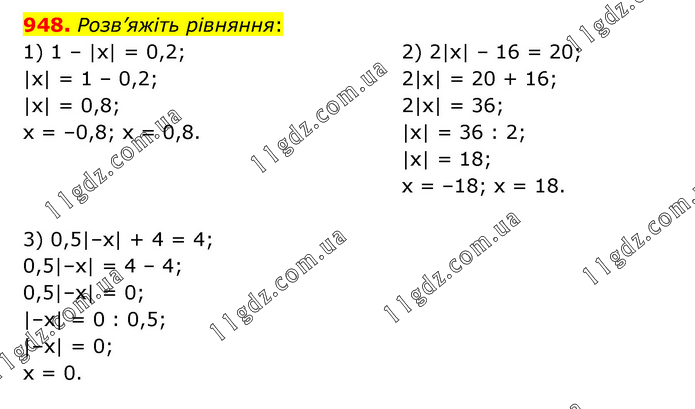 Розв’яжіть рівняння: 1) 1 – |х| = 0,2; |x| = 1 – 0,2; |x| = 0,8; x = –0,8; x = 0,8. 2) 2|х| – 16 = 20; 2|x| = 20 + 16; 2|x| = 36; |x| = 36 : 2; |x| = 18; x = –18; x = 18. 3) 0,5|–х| + 4 = 4; 0,5|–x| = 4 – 4; 0,5|–x| = 0; |–x| = 0 : 0,5; |–x| = 0; x = 0.