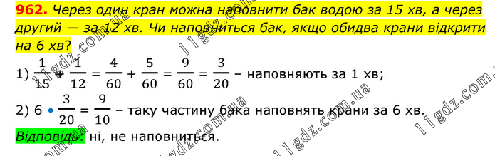 Через один кран можна наповнити бак водою за 15 хв, а через другий — за 12 хв. Чи наповниться бак, якщо обидва крани відкрити на 6 хв? 1) 1/15 + 1/12 = 4/60 + 5/60 = 9/60 = 3/20 – наповняють за 1 хв; 2) 6 • 3/20 = 9/10 – таку частину бака наповнять крани за 6 хв. Відповідь: ні, не наповниться.