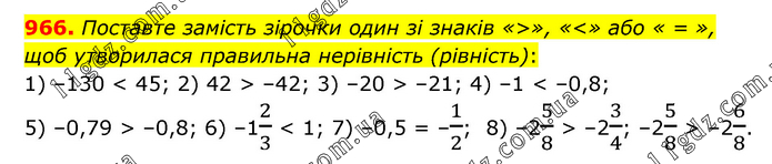 Поставте замість зірочки один зі знаків «>», «<» або « = », щоб утворилася правильна нерівність (рівність): 1) –130 < 45; 2) 42 > –42; 3) –20 > –21; 4) –1 < –0,8; 5) –0,79 > –0,8; 6) –12/3 < 1; 7) –0,5 = –1/2; 8) –25/8 > –23/4; –25/8 > –26/8.