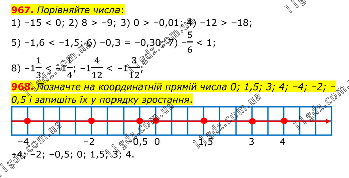 967. Порівняйте числа: 1) –15 < 0; 2) 8 > –9; 3) 0 > –0,01; 4) –12 > –18; 5) –1,6 < –1,5; 6) –0,3 = –0,30; 7) –5/6 < 1; 8) –11/3 < –11/4; –14/12 < –13/12; 968. Позначте на координатній прямій числа 0; 1,5; 3; 4; –4; –2; –0,5 і запишіть їх у порядку зростання. –4; –2; –0,5; 0; 1,5; 3; 4.