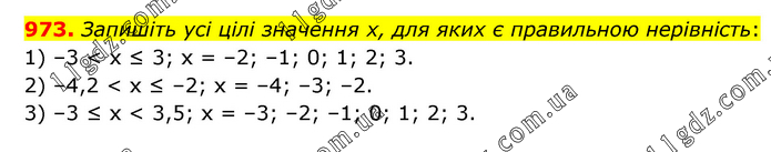 Запишіть усі цілі значення х, для яких є правильною нерівність: 1) –3 < х ≤ 3; х = –2; –1; 0; 1; 2; 3. 2) –4,2 < х ≤ –2; х = –4; –3; –2. 3) –3 ≤ х < 3,5; х = –3; –2; –1; 0; 1; 2; 3.