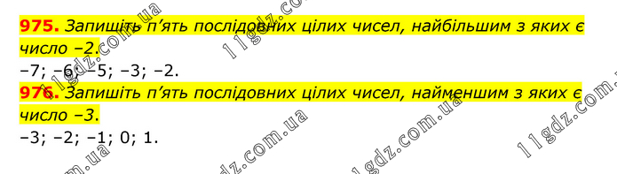 975. Запишіть п’ять послідовних цілих чисел, найбільшим з яких є число –2. –7; –6; –5; –3; –2. 976. Запишіть п’ять послідовних цілих чисел, найменшим з яких є число –3. –3; –2; –1; 0; 1.
