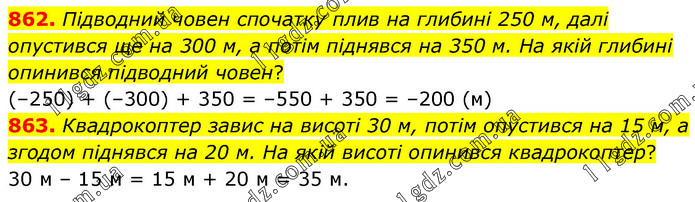 862. Підводний човен спочатку плив на глибині 250 м, далі опустився ще на 300 м, а потім піднявся на 350 м. На якій глибині опинився підводний човен? (–250) + (–300) + 350 = –550 + 350 = –200 (м) 863. Квадрокоптер завис на висоті 30 м, потім опустився на 15 м, а згодом піднявся на 20 м. На якій висоті опинився квадрокоптер? 30 м – 15 м = 15 м + 20 м = 35 м.