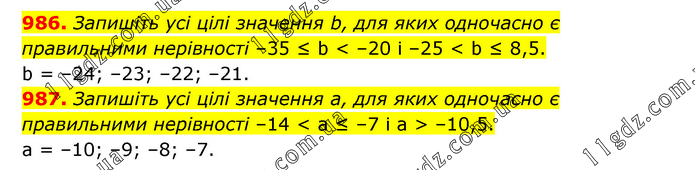 986. Запишіть усі цілі значення b, для яких одночасно є правильними нерівності –35 ≤ b < –20 і –25 < b ≤ 8,5. b = –24; –23; –22; –21. 987. Запишіть усі цілі значення а, для яких одночасно є правильними нерівності –14 < а ≤ –7 і а > –10,5. а = –10; –9; –8; –7.
