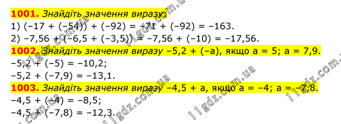1001. Знайдіть значення виразу: 1) (–17 + (–54)) + (–92) = –71 + (–92) = –163. 2) –7,56 + (–6,5 + (–3,5)) = –7,56 + (–10) = –17,56. 1002. Знайдіть значення виразу –5,2 + (–а), якщо а = 5; а = 7,9. –5,2 + (–5) = –10,2; –5,2 + (–7,9) = –13,1. 1003. Знайдіть значення виразу –4,5 + а, якщо а = –4; а = –7,8. –4,5 + (–4) = –8,5; –4,5 + (–7,8) = –12,3.