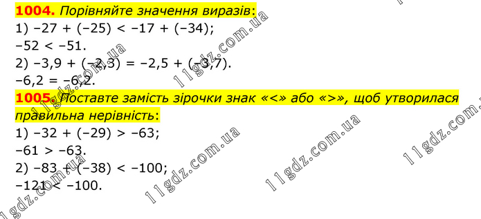 1004. Порівняйте значення виразів: 1) –27 + (–25) < –17 + (–34); –52 < –51. 2) –3,9 + (–2,3) = –2,5 + (–3,7). –6,2 = –6,2. 1005. Поставте замість зірочки знак «<» або «>», щоб утворилася правильна нерівність: 1) –32 + (–29) > –63; –61 > –63. 2) –83 + (–38) < –100; –121 < –100.