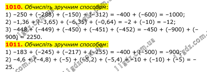 1010. Обчисліть зручним способом: 1) –250 + (–288) + (–150) + (–312) = –400 + (–600) = –1000; 2) –1,36 + (–3,65) + (–6,35) + (–0,64) = –2 + (–10) = –12; 3) –448 + (–449) + (–450) + (–451) + (–452) = –450 + (–900) + (–900) = 2250. 1011. Обчисліть зручним способом: 1) –183 + (–245) + (–217) + (–255) = –400 + (–500) = –900; 2) –4,6 + (–4,8) + (–5) + (–5,2) + (–5,4) = –10 + (–10) + (–5) = –25.