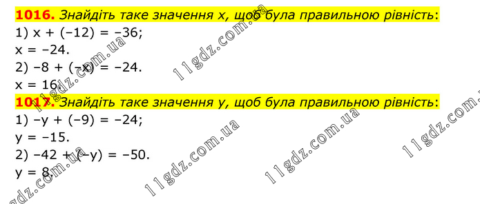 1016. Знайдіть таке значення х, щоб була правильною рівність: 1) х + (–12) = –36; х = –24. 2) –8 + (–х) = –24. х = 16. 1017. Знайдіть таке значення у, щоб була правильною рівність: 1) –у + (–9) = –24; у = –15. 2) –42 + (–у) = –50. у = 8.