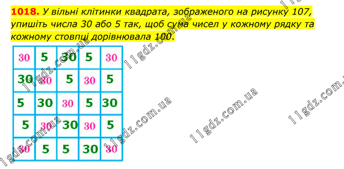 У вільні клітинки квадрата, зображеного на рисунку 107, упишіть числа 30 або 5 так, щоб сума чисел у кожному рядку та кожному стовпці дорівнювала 100.