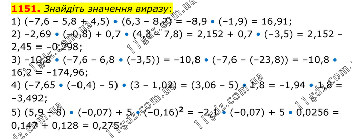 Знайдіть значення виразу: 1) (–7,6 – 5,8 + 4,5) • (6,3 – 8,2) = –8,9 • (–1,9) = 16,91; 2) –2,69 • (–0,8) + 0,7 • (4,3 – 7,8) = 2,152 + 0,7 • (–3,5) = 2,152 – 2,45 = –0,298; 3) –10,8 • (–7,6 – 6,8 • (–3,5)) = –10,8 • (–7,6 – (–23,8)) = –10,8 • 16,2 = –174,96; 4) (–7,65 • (–0,4) – 5) • (3 – 1,02) = (3,06 – 5) • 1,8 = –1,94 • 1,8 = –3,492; 5) (5,9 – 8) • (–0,07) + 5 • (–0,16)2 = –2,1 • (–0,07) + 5 • 0,0256 = 0,147 + 0,128 = 0,275.