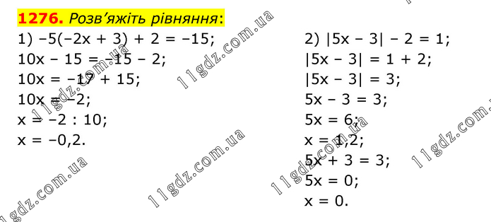 Розв’яжіть рівняння: 1) –5(–2х + 3) + 2 = –15; 10x – 15 = –15 – 2; 10x = –17 + 15; 10x = –2; x = –2 : 10; x = –0,2. 2) |5х – 3| – 2 = 1; |5x – 3| = 1 + 2; |5x – 3| = 3; 5x – 3 = 3; 5x = 6; x = 1,2; 5x + 3 = 3; 5x = 0; x = 0.