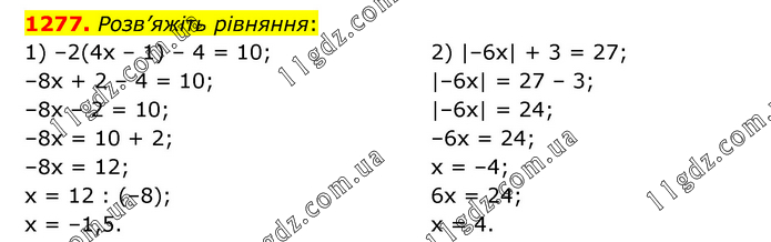 Розв’яжіть рівняння: 1) –2(4х – 1) – 4 = 10; –8x + 2 – 4 = 10; –8x – 2 = 10; –8x = 10 + 2; –8x = 12; x = 12 : (–8); x = –1,5. 2) |–6х| + 3 = 27; |–6x| = 27 – 3; |–6x| = 24; –6x = 24; x = –4; 6x = 24; x = 4.