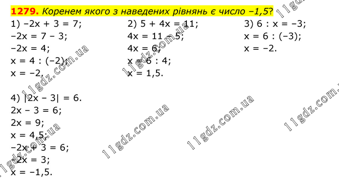 Коренем якого з наведених рівнянь є число –1,5? 1) –2х + 3 = 7; –2х = 7 – 3; –2х = 4; х = 4 : (–2); х = –2. 2) 5 + 4х = 11; 4х = 11 – 5; 4х = 6; х = 6 : 4; х = 1,5. 3) 6 : х = –3; х = 6 : (–3); х = –2. 4) |2х – 3| = 6. 2х – 3 = 6; 2х = 9; х = 4,5; –2х + 3 = 6; –2х = 3; х = –1,5.