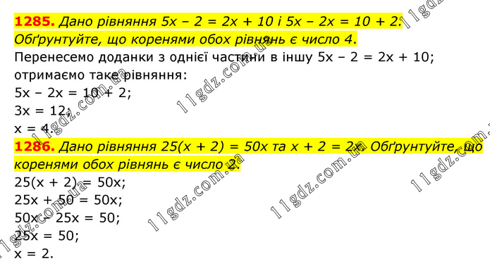 1285. Дано рівняння 5х – 2 = 2х + 10 і 5х – 2х = 10 + 2. Обґрунтуйте, що коренями обох рівнянь є число 4. Перенесемо доданки з однієї частини в іншу 5х – 2 = 2х + 10; отримаємо таке рівняння: 5х – 2х = 10 + 2; 3х = 12; х = 4. 1286. Дано рівняння 25(х + 2) = 50х та х + 2 = 2х. Обґрунтуйте, що коренями обох рівнянь є число 2. 25(х + 2) = 50х; 25х + 50 = 50х; 50х – 25х = 50; 25х = 50; х = 2.