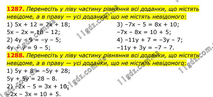 1287. Перенесіть у ліву частину рівняння всі доданки, що містять невідоме, а в праву — усі доданки, що не містять невідомого: 1) 5х + 12 = 2х + 18; 5х – 2х = 18 – 12; 2) 4у – 9 = –у – 5; 4у + у = 9 – 5; 3) –7х – 5 = 8х + 10; –7х – 8х = 10 + 5; 4) –11y + 7 = –3у – 7; –11у + 3у = –7 – 7. 1288. Перенесіть у ліву частину рівняння всі доданки, що містять невідоме, а в праву — усі доданки, що не містять невідомого: 1) 5у + 8 = –5у + 28; 5у + 5у = 28 – 8. 2) –2х – 5 = Зх + 10; –2х – 3х = 10 + 5.
