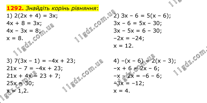 Знайдіть корінь рівняння: 1) 2(2х + 4) = Зх; 4х + 8 = 3х; 4х – 3х = 8; х = 8. 2) Зх – 6 = 5(х – 6); 3х – 6 = 5х – 30; 3х – 5х = 6 – 30; –2х = –24; х = 12. 3) 7(3х – 1) = –4х + 23; 21х – 7 = –4х + 23; 21х + 4х = 23 + 7; 25х = 30; х = 1,2. 4) –(х – 6) = 2(х – 3); –х + 6 = 2х – 6; –х – 2х = –6 – 6; –3х = –12; х = 4.