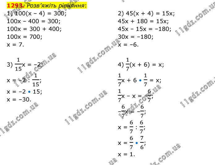 Розв’яжіть рівняння: 1) 100(х – 4) = 300; 100х – 400 = 300; 100х = 300 + 400; 100х = 700; х = 7. 2) 45(х + 4) = 15х; 45х + 180 = 15х; 45х – 15х = –180; 30х = –180; х = –6. 3) 1/15х = –2; х = –2 : 1/15; х = –2 • 15; х = –30. 4) 1/7(х + 6) = х; 1/7х + 6 • 1/7 = х; 1/7х – х = –6/7; –6/7х = –6/7; х = 6/7 : 6/7; х = 6/7 • 7/6; х = 1.