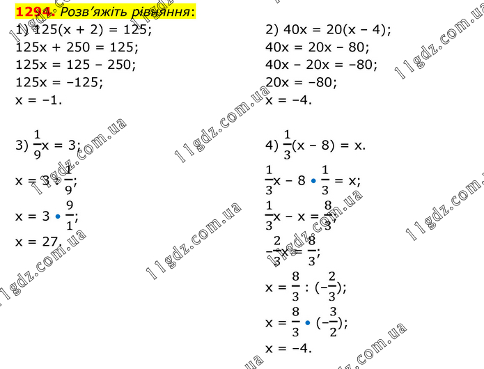 Розв’яжіть рівняння: 1) 125(х + 2) = 125; 125х + 250 = 125; 125х = 125 – 250; 125х = –125; х = –1. 2) 40х = 20(х – 4); 40х = 20х – 80; 40х – 20х = –80; 20х = –80; х = –4. 3) 1/9х = 3; х = 3 : 1/9; х = 3 • 9/1; х = 27. 4) 1/3(х – 8) = х. 1/3х – 8 • 1/3 = х; 1/3х – х = 8/3; –2/3х = 8/3; х = 8/3 : (–2/3); х = 8/3 • (–3/2); х = –4.