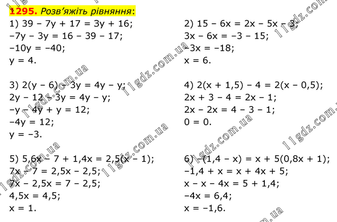 Розв’яжіть рівняння: 1) 39 – 7у + 17 = Зу + 16; –7у – 3у = 16 – 39 – 17; –10у = –40; у = 4. 2) 15 – 6х = 2х – 5х – 3; 3х – 6х = –3 – 15; –3х = –18; х = 6. 3) 2(у – 6) – 3у = 4у – у; 2у – 12 – 3у = 4у – у; –у – 4у + у = 12; –4у = 12; у = –3. 4) 2(х + 1,5) – 4 = 2(х – 0,5); 2х + 3 – 4 = 2х – 1; 2х – 2х = 4 – 3 – 1; 0 = 0. 5) 5,6х – 7 + 1,4х = 2,5(х – 1); 7х – 7 = 2,5х – 2,5; 7х – 2,5х = 7 – 2,5; 4,5х = 4,5; х = 1. 6) –(1,4 – х) = х + 5(0,8х + 1); –1,4 + х = х + 4х + 5; х – х – 4х = 5 + 1,4; –4х = 6,4; х = –1,6.