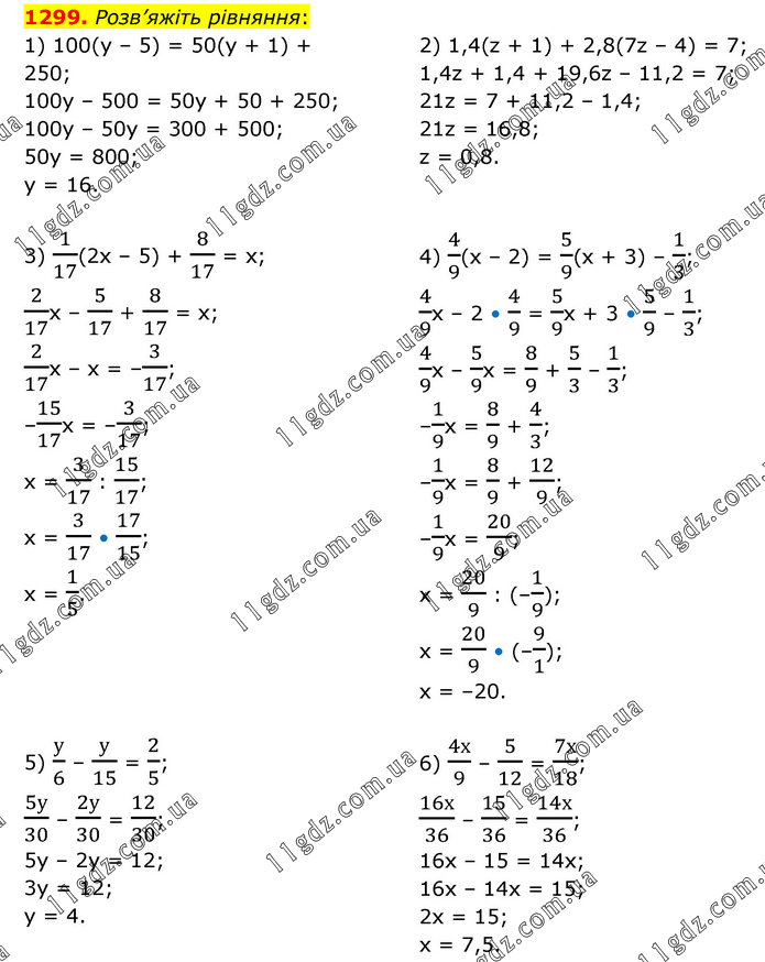 Розв’яжіть рівняння: 1) 100(у – 5) = 50(у + 1) + 250; 100y – 500 = 50y + 50 + 250; 100y – 50y = 300 + 500; 50y = 800; y = 16. 2) 1,4(z + 1) + 2,8(7z – 4) = 7; 1,4z + 1,4 + 19,6z – 11,2 = 7; 21z = 7 + 11,2 – 1,4; 21z = 16,8; z = 0,8. 3) 1/17(2х – 5) + 8/17 = х; 2/17х – 5/17 + 8/17 = х; 2/17х – х = –3/17; –15/17х = –3/17; х = 3/17 : 15/17; х = 3/17 • 17/15; х = 1/5. 4) 4/9(х – 2) = 5/9(х + 3) – 1/3; 4/9х – 2 • 4/9 = 5/9х + 3 • 5/9 – 1/3; 4/9х – 5/9х = 8/9 + 5/3 – 1/3; –1/9х = 8/9 + 4/3; –1/9х = 8/9 + 12/9; –1/9х = 20/9; х = 20/9 : (–1/9); х = 20/9 • (–9/1); х = –20. 5) у/6 – у/15 = 2/5; 5у/30 – 2у/30 = 12/30; 5у – 2у = 12; 3у = 12; у = 4. 6) 4х/9 – 5/12 = 7х/18; 16х/36 – 15/36 = 14х/36; 16х – 15 = 14х; 16х – 14х = 15; 2х = 15; х = 7,5.