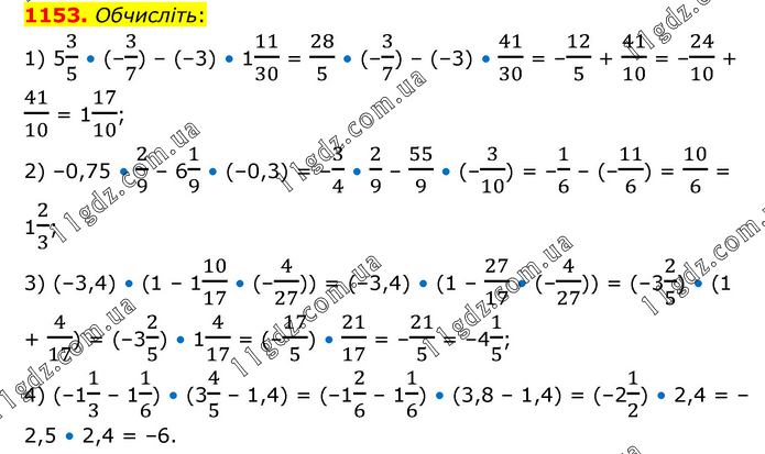 Обчисліть: 1) 53/5 • (–3/7) – (–3) • 111/30 = 28/5 • (–3/7) – (–3) • 41/30 = –12/5 + 41/10 = –24/10 + 41/10 = 117/10; 2) –0,75 • 2/9 – 61/9 • (–0,3) = –3/4 • 2/9 – 55/9 • (–3/10) = –1/6 – (–11/6) = 10/6 = 12/3; 3) (–3,4) • (1 – 110/17 • (–4/27)) = (–3,4) • (1 – 27/17 • (–4/27)) = (–32/5) • (1 + 4/17) = (–32/5) • 14/17 = (–17/5) • 21/17 = –21/5 = –41/5; 4) (–11/3 – 11/6) • (34/5 – 1,4) = (–12/6 – 11/6) • (3,8 – 1,4) = (–21/2) • 2,4 = –2,5 • 2,4 = –6.