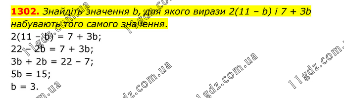 Знайдіть значення b, для якого вирази 2(11 – b) і 7 + Зb набувають того самого значення. 2(11 – b) = 7 + Зb; 22 – 2b = 7 + 3b; 3b + 2b = 22 – 7; 5b = 15; b = 3.