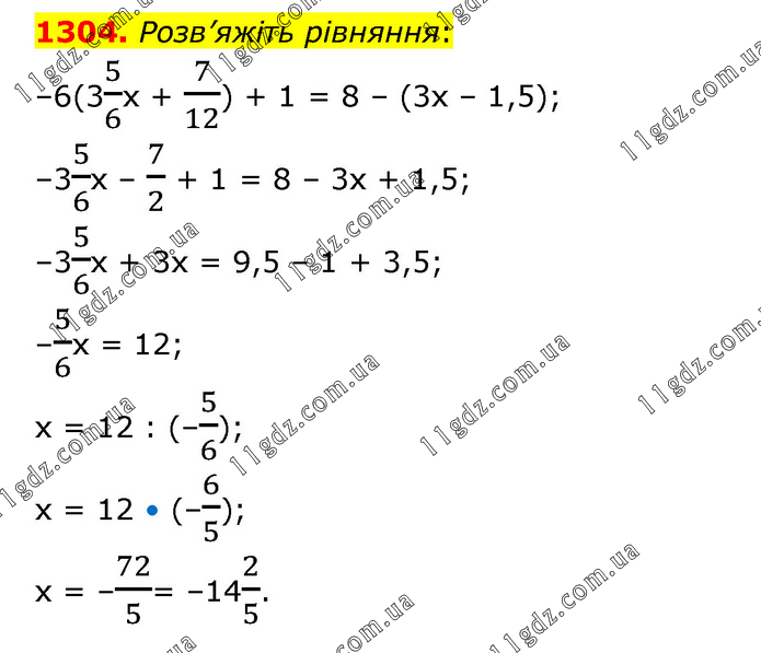 Розв’яжіть рівняння: –6(35/6х + 7/12) + 1 = 8 – (3х – 1,5); –35/6х – 7/2 + 1 = 8 – 3х + 1,5; –35/6х + 3х = 9,5 – 1 + 3,5; –5/6х = 12; х = 12 : (–5/6); х = 12 • (–6/5); х = –72/5= –142/5.