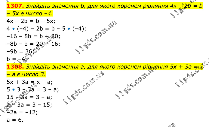 1307. Знайдіть значення b, для якого коренем рівняння 4х – 2b = b – 5х е число –4. 4х – 2b = b – 5х; 4 • (–4) – 2b = b – 5 • (–4); –16 – 8b = b + 20; –8b – b = 20 + 16; –9b = 36; b = –4. 1308. Знайдіть значення а, для якого коренем рівняння 5х + 3а = х – а є число 3. 5х + 3а = х – а; 5 • 3 – 3a = 3 – а; 15 – 3а = 3 – а; а – 3а = 3 – 15; –2а = –12; а = 6.